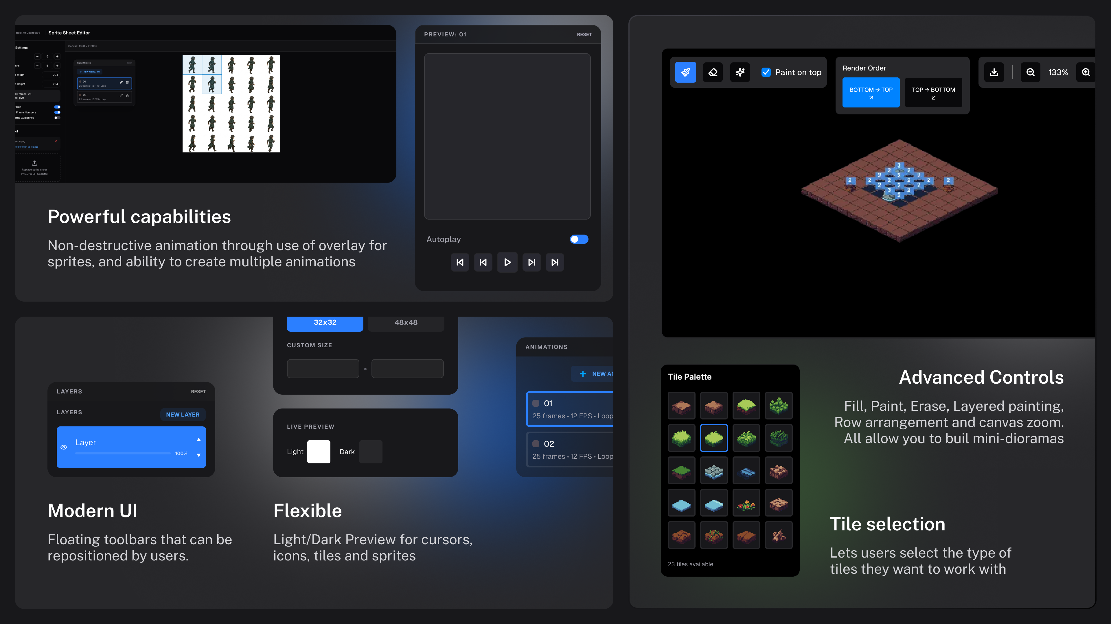 - Animation system with frame ranges, FPS control, and playback modes